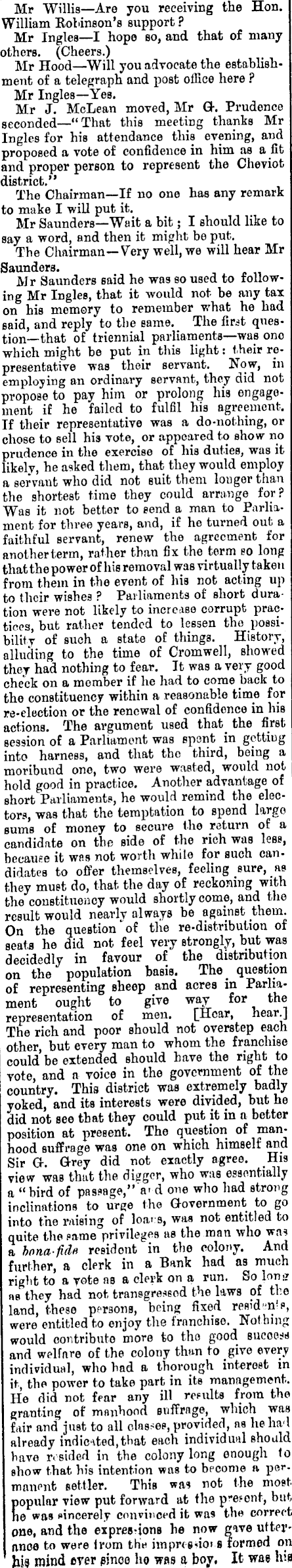 Mr Willis —Are you receiving the Hon. William Robinson's support ? Mr Ingles—l hope so, and that of many others. (Cheers.) Mr Hood—Will you advocate the establishment of a telegraph and post office here ? Mr Ingles—Yes. Mr J. McLean moved, Mr Gh Prudence seconded—" That this meeting thanks Mr Ingles for his attendance this evening, and proposed a vote of confidence in him as a fit and proper person to represent the Cheviot district." The Chairman—lf no one has any remark to make I will put it. Mr Saunders—Wait a bit; I should like to say a word, and then it might be put. The Chairman—Very well, we will hear Mr Saunders. Mr Saunders said he was so used to following Mr Ingles, that it would not be any tax on his memory to remember what he had said, and reply to the same. The firat question—that of triennial parliaments—was one which might be put in this light: their representative was their servant. Now, in employing an ordinary servant, they did not propose to pay him or prolong his engagement if he failed to fulfil his agreement. If their representative was a do-nothing, or chose to sell his vote, or appeared to show no prudence in the exercise of his duties, was it likely, he asked them, that they would employ a servant who did not suit them longer than the shortest time they could arrange for? Was it not better to send a man to Parliament for three years, and, if he turned out a faithful servant, renew the agreement for anotherterm, rather than fix the term no long that the power of his removal was virtually taken from them in the event of his not acting up to their wishes ? Parliaments of short duration were not likely to increase corrupt practices, but rather tended to lessen the possibility of such a state of things. History, alluding to the time of Cromwell, showed they had nothing to fear. It was a very good check on a member if he had to come back to the constituency within a reasonable time for re-election or the renewal of confidence in his actions. The argument used that_ the first session of a Parliament was spent in getting into harness, and that the third, being a moribund one, two were wasted, would not hold good in practice. Another advantage of short Parliaments, he would remind the electors, was that the temptation to spend largo sums of money to secure the return of a candidate on the side of the rich was less, because it was not worth while for such candidates to offer themselves, feeling sure, as they must do, that the day of reckoning with the constituency would shortly come, and the result would nearly always be against them. On the question" of the re-distribution of seats he did not feel very strongly, but was decidedlv in favour of the distribution on the' population basis. The question of representing sheep and acres in Parliament ought to give way for the representation of men. [Hear, hear J The rich and poor should not overstep each other, but every man to whom the franchise could be extended should have the right to vote, and a voice in the government of the country. This district was extremely badly voked, and its interests were divided, but he did not see that they could put it in a better position at present. The question of manhood suffrage was one on which himself and Sir C Grrey did not exactly agree. His view was that the digger, who was essentially a " bird of passage," a- d one who had strong inclinations to urge the Government to go into the raising of loans, was not entitled to quite the same privileges as the man who was a bona-fid* resident in the colony. And further, a clerk in a Bank had as much right to a vote as a clerk on a run. So lort.? ns they had not transgressed the laws of the land, these persons, being fixed resid-n'e, were entitled to enjoy the franchise. Nothing would contribute more to the good succor and welfare of the colony than to give everv individual, who had a thorough interest in it, the power to take part in its management. lie did not fear any ill remits from the granting of mnnhood suffrage, which was fair and just to all classes, provided, as he ha I already indicated,that each individual should have resided in the colony long enough to show that his intention was to become a per. roanent settler. This was not the most popular view put forward at the prefent, but he was sincerely convinced it was the correct one, and the expres-ions he now gave utterance to were trom the iuipresiioi s formed on Shis mind erer since ho was a boy. It was \v.&