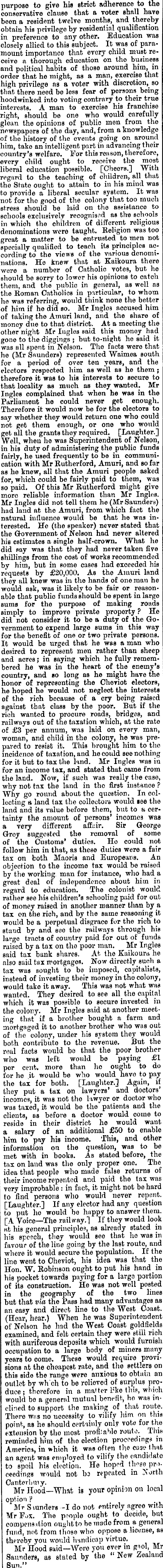 purpose to give his strict adherence to the conservative clause that a voter shall have been a resident twelve months, and thereby obtain his privilege by residential qualification in preference to any other. Education was closely allied to this subject. It was of paramount importance that every child must receive a thorough education on tho business and political habits of those around him, in ordor that he might, as a man, exercise that high privilege as a voter with discretion, so that there need be less fear of persons being hoodwinked into voting contrary to their true interests. A man to exercise his franchise right, should be one who would carefully glean the opinions of public men from the newspapers of the day, and, from a knowledge of tho history of the events going on around him, take an intelligent part in advancing their country's welfare. For this reason, therefore, every child ought to receive the most liberal education possible. [Cheers.] With regard to the teaching of children, all that the State ought to attain to in his mind was to provide a liberal secular Bystem. It was not for the good of the colony that too much stress should be laid on the assistance to schools exclusively recognised as the schools in which the children of different religious denominations were taught. Religion was too great a matter to be entrusted to men not specially qualified to teach its principles according to the views of the various denominations. Ho knew that at Kaikoura there were a number of Catholic votes, but he should be sorry to lower his opinions to catch them, and the public in general, as well as the Roman Catholics in particular, to whom he was referring, would think none the better of him if he did so. Mr Inglo3 accused him of taking tho Amuri land, and the share of money due to that district. At a meeting the other night Mr Ingles said this money had gone to the diggings ; but to-night he said it was all spent in Nelson. Tho facts were that he (Mr Saunders) represented Waimea south for a period of over ten years, and the electors respected him as well as he them ; therefore it was to his interests to secure to that locality as much as they wanted. Mr Ingles complained that when he was in the Parliament he could never get enough. Therefore it would now be for the electors to say whether they would return one who could not get them enough, or one who would get all the grants they required. [Laughter.] Well v when ho was Superintendent of Nelson, in his duty of administering the public funds fairly, he used frequently to be in communication with Mr Rutherford, Amuri, and so far as he knew, all that the Amuri people asked for, which could be fairly paid to them, was so paid. Of this Mr Rutherford might give more reliable information than Mr Ingles. Mr Ingles did not tell them he (Mr Saunders) had land at the Amuri, from which fact the natural influence would be that he was interested. He (the speaker) never stated that the Government of Nelson had never altered his estimates a single half-crown. What he did say was that they had never taken five shillings from the cost of works recommended by him, but in some cases had exceeded his requests by £20,000. As the Amuri land they all knew was in the hands of one man he would ask, was it likely to be fair or reasonable that public funds should be spent in large sums for tho purpose of making roads simply to improve private property ? He did not consider it to be a duty of the Government to expend large sums in this way for the benefit of one or two private persons. It would be urged that he was a man who desired to represent men rather than sheep and acres; in saying which he fully remembered he was in the heart of the enemy's country, and bo long as he might have the honor of representing the Cheviot electors, he hoped he would not neglect the interests of the rich because of a cry being raised against that class by the poor. But if the rich wanted to procure roads, bridges, and railways out of the taxation which, at the rate of £3 per annum, was laid on every man, woman, and child in the colony, he was prepared to resist it. This brought him to the incidence of taxation, and he could see nothing for it but to tax the land. Mr Ingles was in for an income tax, and stated that came from the land. Now, if such was really the case, why not tax the land in the first instance ? Why go round about the question. In collecting a land tax the collectors would lee the land and its value before them, but to a certainty the amount of persons' incomes was a very different affair. Sir George Grey suggested the removal of some of the Customs' duties. Ho could not follow him in that, a 3 these duties were a fair tax on both Maoris and Europeans. An objection to the income tax would be raised by the working man for instance, who had a great deal of independence about him in regard to education. The colonist would rather see his children's schooling paid for out of money raised in another manner than by a tax on the rich, and by the same reasoning it would be a perpetual disgrace fur the rich to stand by and see the railways through his large tracts of country paid for out of funds raised by a tax on tho poor man. Mr Ingles said tax bank shares. At the Kaikoura he also said tax mortgages. Now directly such a tax was sought to be imposed, capitalists, instead of investing their money in tho colony, would take it away. This was not what was wanted. They desired to see all the capital which it was possible to secure invested in the colony. Mr Ingles said at another meeting that if a brother bought a farm and mortgaged it to another brother who was out of the colony, under his systorn they would both contribute to the revenue. But the real facts would be that the poor brother who was left would be paying £1 per cent, more than he ought to do for he it would be who would have to pay the tax for both. [Laughter.] Again, if they put a tax on lawyers' and doc