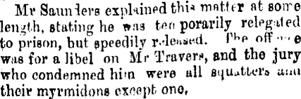 Mr Saun-iera explained fchi» matter at soire length, stating he was tenporarily relegated to prison, but speedilv cleaned. Php off •• ■ e was for a libel on Mr Travew, and the pry who condemned hi'O were ull BifiutUsrs stun their myrmidons except- one,