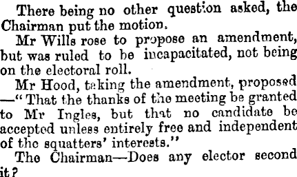 There being no other question asked, the Chairman put the motion, Mr Wills rose to propose an amendment, but was ruled to be incapacitated, not being on the electoral roll. Mr Hood, taking the amendment, propossd —" That the thanks of the meeting be granted to Mr Ingles, but that no candidate be accepted unless entirely free and independent of the squatters' interests." Tho Chairman —Does any elector second it?
