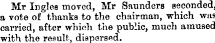 Mr Ingles moved, Mr Saunders seconded, a vote of thanks to the chairman, which was carried, after which the public, much amused with the result, dispersed. __