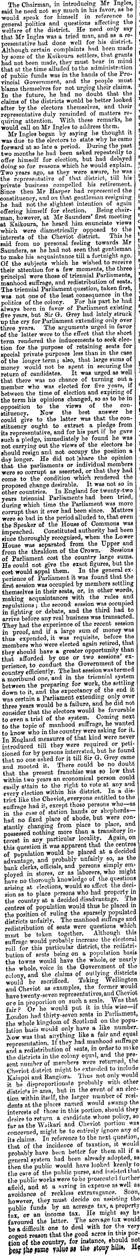 The Chairman, in introducing Mr Ingles, said he need not say much in his favor, as he -would speak for himself in reference to general politics and questions affecting the welfare of the district. He need only say that Mr Ingles was a tried man, and as a representative had done well for his district. Although certain complaints had heen made by some of the Kaikoura settlers, that grants had not been made, thev must bear in mind that at the time alluded to the administration of public funds was in the hands of the Provincial Government, and the people must blame themselves for not urging their claims. In the future, he had no doubt that the claims of the districts would be better looked after by the electors themselves, and their representative duly reminded of matters requiring attention. "With these remarks, ho would call on Mr Ingles to address them. Mr Ingles began by saying he thought it was due to the electors to state why he camo forward at so late a period. During the past two months he had been asked repeatedly to offer himself for election, but had delayed doing so for reasons which he would explain. Two years ago, as they were aware, he was the representative of that district, till his pi-ivate business compelled his retirement. Since then Mr Harper had represented the constituency, and on that gentleman resigning he had not the slightest intention of again offering himself for election. Being chairman, however, at Mr Saunders' first meeting at Kaikoura, he heard him enunciate views which wore diametrically opposed to the interests of the Cheviot district. This he said from no personal feeling towards Mr Saunders, as he had not seen that gentleman to make his acquaintance till a fortnight ago. Of the subjects which he wished to receive their attention for a few moments, the three principal were those of triennial Parliaments, manhood suffrage, and redistribution of seats. The triennial Parliament question, taken first, was not one of the least consequence in the politics of the colony. For his part he had always been in favor of Parliament existing five years, but Six- G. Grey had lately struck up the cry for Parliament extending only over three years. The arguments urged in favor of the latter were to the effect that the short term rendered the inducements to seek election for the purpose of retaining seats for special private purposes less than in the case of the longer term; also, that large sums of money would not be spent in securing the return of candidates. It was urged as well that there was no chance of turning out a member who was elected for five years, if between the time of election and expiring of the term his opinions changed, so as to be in opposition to the views of the constituency. Now the best answer he could give to the latter was that the constituency ought to extract a pledge from its representative, and for his part if he gave such a pledge, immediately he found he was not carrying out the views of the electors he should resign and not occupy the position a day longer. He did not [share the opinion that the parliaments or individual members were so corrupt as asserted, or that they had come to the condition which rendered the proposed change desirable. It was not so in other countries. In England for twenty-two years triennial Parliaments had been tried, during which time the Parliament was more corrupt than it ever had been since. Matters were so bad in the period alluded to, that even the Speaker of the House of Commons was impeached. Constituted authority had been since thoroughly recognised, when the Lower House was separated from the Upper and from the thraldom of the Crown. Sessions of Parliament cost the country large sumß. He could not give the exact figures, but the cost would appal them. In the general experience of Parliament it was found that the first session was occupied by members settling themselves in their seats, or, in other words, making acquaintances with the rules and regulations ; the second session was occupied in fighting or debate, and the third had to arrive before any real business was transacted. They had the experience of the recent session in proof, and if a large sum of money was thus expended, it was requisite, before the members who were elected again retired, that they should have a greater opportunity than that afforded by one or two sessions experience, to conduct the Government of the country efficiently. The last session was termed a moribund one, and in the triennial system between the preparing for work the settling down to it, and the expectancy of the end it was certain a Parliament extending only over three years would be a failure, and he did not consider that the electors would be favorable to even a trial of the system. Coming next to the topic of manhood suffrage he wanted to know who in the country were asking tor it. In England measures of that kind were never introduced till they were required or petitioned for by persons interested, but he tound that no one asked for it till Sir G. Grey came and mooted it. There could be no doubt that the present franchise was so low that within two years an economical person could easily attain to the right to vote at any and every election within his district. In a district like the Cheviot, everyone entitled to the Buffrage had it, except thoso persons who—as in the case of station hands or shepherdshad no fixed place of abode, but were constantly changing from place to place, and possessed nothing more than a transitory interest in any particular locality. Again on this question it was apparent that the centres of population would bo placed at a decided advantage, and probably unfairly so, as the bank clerks, officials, and persons simply employed in stores, or as laborers, who might have no thorough knowledge of the questions arising at elections, would so affect the decision as to place persons who had property in the country at a decided disadvantage. The cent