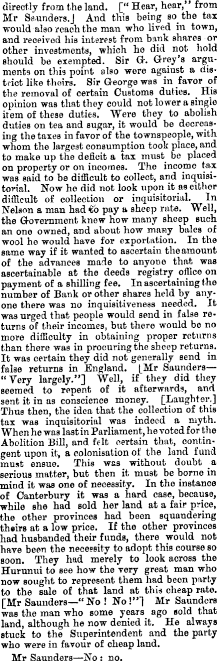 directly from the land. [" Hear, hoar," from Mr Saunders. J And this being so the tax would also reach the man who lived in town, and received his interest from bank shares or other investments, which he did not hold should be exempted. Sir G. Grey's arguments on this point also were against a district like theirs. Sir George was in favor of the removal of certain Customs duties. His opinion was that they could not lower a single item of these duties. Were they to abolish duties on tea and sugar, it would be decreasing the taxes in favor of the townspeople, with whom the largest consumption took place, and to make up the deficit a tax must be placed on property or on incomes. The income tax was said to be difficult to collect, and inquisitorial. Now he did not look upon it as either difficult of collection or inquisitorial. In Nelson a man had i'o pay a sheep rate. Well, the Government know how many sheep such an one owned, and about how many bales of wool he would have for exportation. In the same way if it wanted to ascertain the amount of the advances made to anyone that was ascertainable at the deeds registry office on payment of a shilling fee. In ascertaining the number of Bank or other shares held by anyone there was no inquisitiveness needed. It was urged that people would send in false returns of their incomes, but there would be no more difficulty in obtaining proper returns than there was in procuring the sheep returns. It was certain they did not generally send in false returns in England. L Mr Saunders—- " Very largely."] Well, if they did they seemed to repent of it afterwards, and sent it in as conscience money. [Laughter.] Thus then, the idea that the collection of this tax was inquisitorial was indeed a myth. When he was last in Parliament, he voted for the Abolition Bill, and felt certain that, contingent upon it, a colonisation of the land fund must ensue. This was without doubt a serious matter, but then it must be borne in mind it was one of necessity. In the instance of Canterbury it was a hard case, because, while she had sold her land at a fair price, the other provinces had been squandering theirs at a low price. If the other provinces had husbanded their funds, there would not have been the necessity to adopt this course so soon. They had merely to look across the Hurunui to see how the very great man who now sought to represent them had been party to the sale of that land at this cheap rate. [Mr Saunders—" No ! No!"l Mr Saunders was the man who some years ago sold that land, although he now denied it. He always stuck to the Superintendent and the party who were in favour of cheap land. Mr Saunders —No : no.