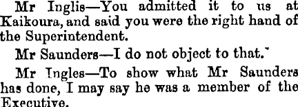 Mr Inglis —You admitted it to its at Kaikoura, and said you were the right hand of the Superintendent. Mr Saunders —I do not object to that." Mr Tngles—To show what Mr Saunders has done, I may say he was a member of the Executive.