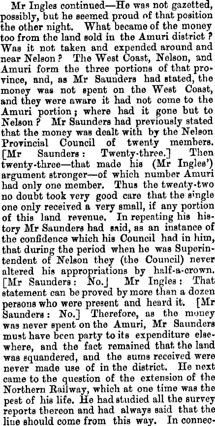 Mr Ingles continued—He was not gazetted, possibly, but he seemed proud of that position the other night. What became of the money too from the land sold in the Amuri district ? Was it not taken and expended around and near Nelson ? The West Coast, Nelson, and Amuri form the three portions of that province, and, as Mr Saunders had Btated, the money was not spent on the West Coast, and they were aware it had not come to the Amuri portion; where had it gone but to Nelson ? Mr Saunders had previously stated that the money was dealt with by the Nelson Provincial Council of twenty members. [Mr Saunders : Twenty-three.] Then twenty-three—that made his (Mr Ingles') argument stronger —of which number Amuri had only one member. Thus the twenty-two no doubt took very good care that the single one only received a very small, if any portion of this land revenue. In repeating his history Mr Saunders had said, as an instance of the confidence which his Council had in him, that during the period when he was Superintendent of Nelson they (the Council) never altered his appropriations by half-a-crown. [Mr Saunders: No.J Mr Ingles: That statement can be proved by more than a dozen persons who were present and heard it. [Mr Saunders: No.] Therefore, as the money was never spent on the Amuri, Mr Saunders must have been party to its expenditure elsewhere, and the fact remained that the land was squandered, and the Bums received were never made use of in the district. He next came to the question of the extension of the Northern Railway, which at one time was the pest of his life. He had studied all the survey reports thereon and had always said that the line should come from this way. In connec-