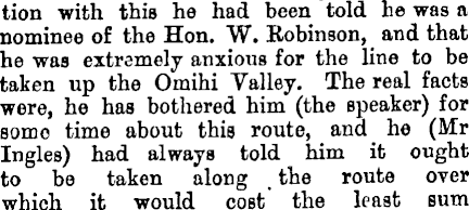 tion with this he had been told he was a nominee of the Hon. W. Robinson, and that he was extremely anxious for the line to be taken up the Omihi Valley. The real facts were, he has bothered him (the speaker) for somo time about this route, and he (Mr Ingles) had always told him it ought to be taken along , the route over which it would cost the least sum