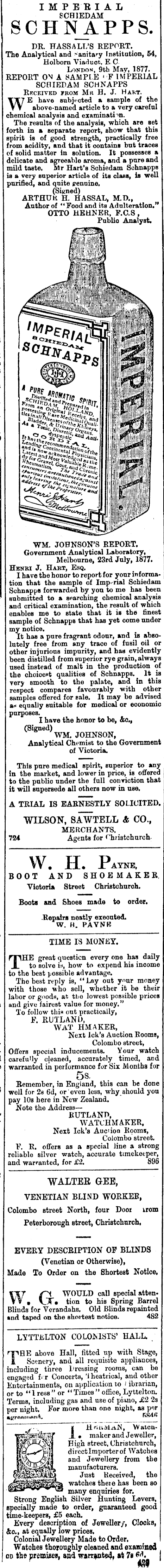 IMPERIAL SCHIEDAM SCHNAPPS. DR. HASS ALL’S REPORT. The Analytical and Holborn Viaduct. E C London, 9th Mav, 1877. REPORT ON A SAMPLE - F IMPERIAL SCHIEDAM SCHNAPPS Rkckivkd from Mr H. J. Hart. WE have subjected a sample of the above-named article to a very careful chemical analysis and examination. The results of the analysis, which are set forth in a separate report, show that this spirit is of good strength, practically free from acidity, and that it contains but traces of solid matter in solution. It possesses a delicate and agreeable aroma, and a pure and mild taste, Mr Hart’s Schiedam Schnapps is a very superior article of its class, Is well purified, and quite genuine, (Signed) ARTHUR H. HASSAL, M.D., Author of “Food and its Adulteration,” OTTO HEHNER, F.C.S , Public Analyst, 8 0Bn Apps "*''<*7/0 ""ia rL‘° ns , y^\\ WM. JOHNSON’S REPORT. Government Analytical Laboratory, Melbourne, 23rd July, 1877. Henri J. Hart, Esq. I have the honor to report for your informa tion that the sample of Imp. rial Schiedam Schnapps forwarded by you to me has been submitted to a searching chemical analysis and critical examination, the result of which enables me to state that it is the finest sample of Schnapps that has yet come under my notice. It has a pure fragrant odour, and is absolutely free from any trace of fusil oil or other injurious impurity, and has evidently been distilled from superior rye grain, always used instead of malt in the production of the choicest qualities of Schnapps. It is very smooth to the palate, and in this respect compares favourably with other samples offered for sale. It may be advised a* equally suitable for medical or economic purposes. I have the honor to be, &c., (Signed) WM. JOHNSON, Analytical Chemist to the Government of Victoria. This pure medical spirit, superior to any in the market, and lower in price, is offered to the public under the full conviction that it will supersede all others now in use. A TRIAL IS EARNESTLY SOLICITED. WILSON, SAWTELL & CO., MERCHANTS, 724 Agents for Christchurch W. H. P AYNE, BOOT AND SHOEMAKER Victoria Street Christchurch. Boots and Shoes made to order. Repairs neatly executed. W. H. PAYNB TIME IS MONEY. THE great question every one has daily to solve is, how to expend his income to the best possible advantage. The best reply is, “Lay out y«ur money with those who sell, whether it be their labor or goods, at the lowest possible prices and give fairest value for money,” To follow this out practically, F. RUTLAND. WAT HMAKER, Next lek’s Auction Rooms, Colombo street, Offers special inducements. Your watch carefully ejeaned, accurately timed, and warranted in performance for Six Months for ss. Remember, in England, this can be done well for 2s 6d, or even less, why should you pay 10s here in New Zealand. Note the Address— RUTLAND, WATCHMAKER. Next Ick’s Auc’ion Rooms, Colombo street. F. R. offers as a special line a strong reliable silver watch, accurate timekeeper, and warranted, for £2. 896 WALTEE GEE, VENETIAN BLIND WORKER, Colombo street North, four Door irom Peterborough street, Christchurch, EVERY DESCRIPTION OF BLINDS (Venetian or Otherwise), Made To Order on the Shortest Notice, W i'y WOULD call special attenTv B \JT« tion to his Spring Barrel Blinds for Verandahs, Old Blinds repainted and taped on the shortest notice. 482 LYTTELTON COLONISTS’ HALL. above Hall, fitted up with Stage, [ Scenery, and all requisite appliances, eluding three Dressing rooms, can be gaged f< r Concerts, '.I heatrical, and other itertainmeuts, on application to 1 ibrarian, to “ 1 ress” or “Times ” office, Lyttelton, >rms, including gas and use of piano, £2 2s r night. For more than ono night, as per ronrnnrit. f>S4f> H*<uMaN, Watcu,l » maker and Jeweller, High street, Christchurch, direct Importer of Watches and Jewellery from the manufacturers. Just Received, the watches there has been so many enquiries for. Strong English Silver Hunting Levers, specially made to order, guaranteed good time-keepers, £5 each. Every description of Jeweller/, Clocks, &0., at equally low prices. Colonial Jewellery Made to Order. Watches thoroughly cleaned and examined cd the premises, and warranted* at 7a fid. fers?