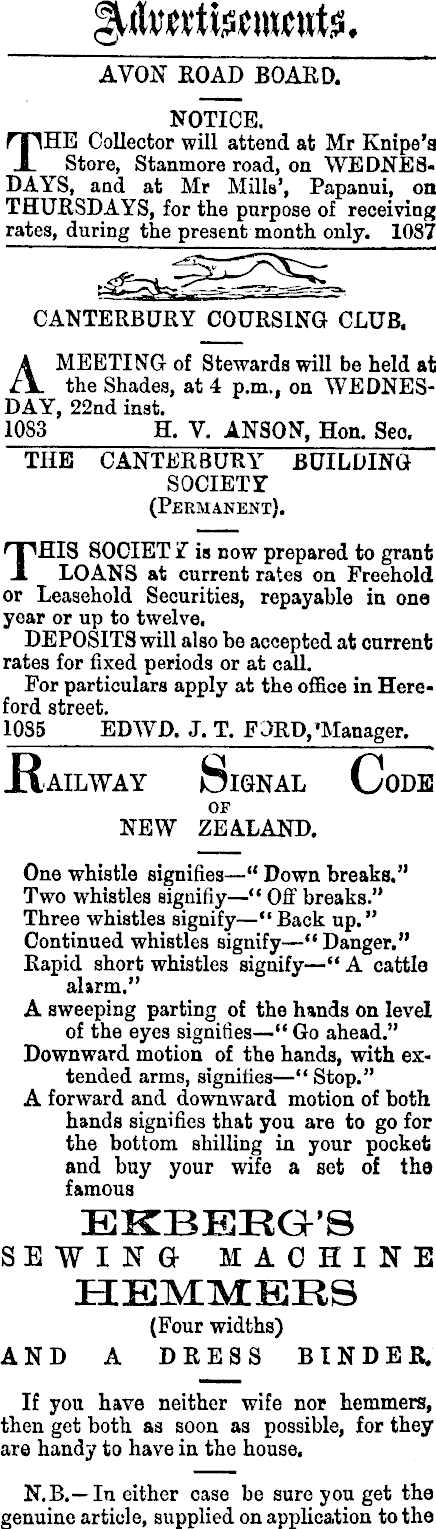 AVON ROAD BOARD. NOTICE. ,HE Collector will attend at Mr Knipe'a __ Store, Stanmore road, on WEDNESDAYS, and at Mr Mills', Papanui, on THURSDAYS, for the purpose of receiving rates, during the present month only. 1087 CANTERBURY COURSING CLUB. ' MEETING of Stewards will be held at L the Shades, at 4 p.m., on WEDNESDAY, 22nd inst. IQB3 H. V. ANSON, Hon. Sec. THE CANTERBURY BUILDING SOCIETY (Permanent). SOCIETY is now prepared to grant LOANS at current rates on Freehold or Leasehold Securities, repayable in one year or up to twelve. DEPOSITS will also be accepted at current rates for fixed periods or at call. For particulars apply at the office in Hereford street. 10S5 EDWD. J. T. FJRD,'Manager. AILWAY /IGNAL NEW ZEALAND. One whistle signifies—" Down breaks." Two whistles signifiy—" Off breaks." Three whistles signify—" Back up." Continued whistles signify—" Danger." Rapid short whistles signify—" A cattle alarm." A sweeping parting of the hands on level of the eyes signifies— '* Go ahead." Downward motion of the hands, with extended arms, signifies—" Stop." A forward and downward motion of both hands signifies that you are to go for the bottom shilling in your pocket and buy your wife a set of the famous EKBERG'B SEWING MACHINE HEMMERS (Four widths) AND A DRESS BINDER. If you have neither wife nor hemmers, then get both as soon as possible, for they are handy to have in the house. N.B.—ln either case be sure you get the genuine article, supplied on application to the