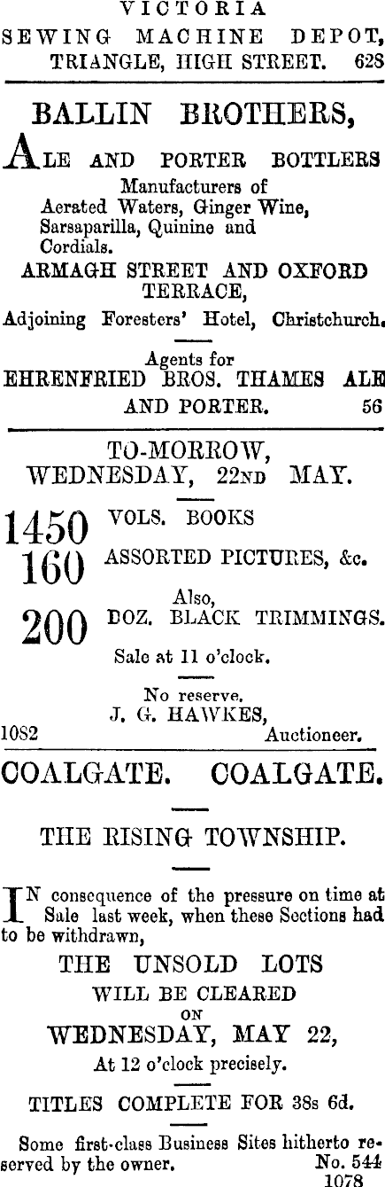 VICTORIA SEWING MACHINE DEPOT, TRIANGLE, HIGH STREET. 62S BALLIN BROTHERS, ILE AND PORTER BOTTLERS Manufacturers of Aerated Waters, Ginger Wine, Sarsaparilla, Quinine and Cordials. ARMAGH STREET AND OXFORD TERRACE, Adjoining Foresters' Hotel, Ckristchurch, Agents for EHRENFRIED BROS. THAMES ALE AND PORTER, 56 TO-MOREOW, WEDNESDAY, 22nd MAY. 1450 160 VOLS. BOOKS ASSORTED PICTURES, &c. Also, DOZ. BLACK TRIMMINGS. Sale at 11 o'clock. No reserve. J. G. HAWKES, Auctioneer. COALGATE. COALGATE. THE RISING TOWNSHIP. Jl Sale last week, when these Sections had to be withdrawn, THE UNSOLD LOTS WILL BE CLEARED ON WEDNESDAY, MAY 22, At 12 o'clock precisely. TITLES COMPLETE FOR 38s 6d. Some first-class Business Sites hitherto reserved by the owner. No. 544 1078