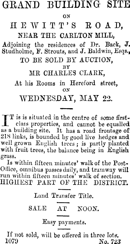 GEAND BUILDING SITE ON HEWITT'S ROAD, NEAR THE CARLTON MILL, Adjoining the residences of Dr. Back, J. Studholme, F. Strouts, and J". Baldwin, Esqs., TO BE SOLD BY AUCTION, BY MR CHARLES CLARK, At his Rooms in Hereford street, ON WEDNESDAY, MAY 22. IT is is situated in the centre of some iirstclass properties, and cannot be equalled us a building site. It has a road frontage of 218 links, is bounded by good live hedges and well grown English trees ; is partly planted with fruit trees, the balance being in English grass. Is within fifteen minutes' walk of the PostOtlice, omnibus passes daily, and tramway will run within fifteen minutes' walk of section. HIGHEST PART OE THE DISTRICT. Land Transfer Title. SALE AT NOON. Easy payments. If not sold, will be offered in three lots'. 1070 No. 723