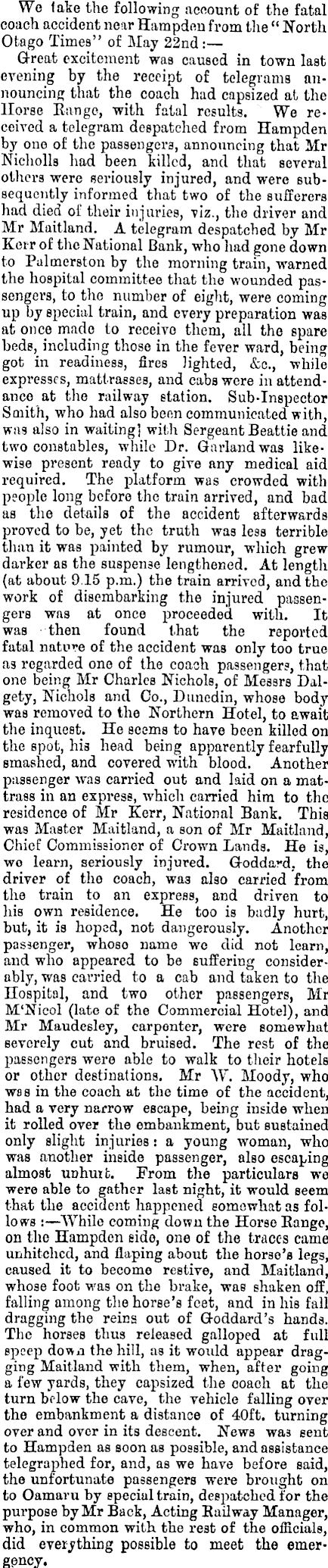 We take the following account of the fatal coach accident near Hampden from the " North Otago Times" of May 22nd:— Great excitement was caused in town last evening by the receipt of telegrams announcing that the coach had capsized at the Horse Range, with fatal results. We received a telegram despatched from Hampden by one of the passengers, announcing that Mr Nicholls had been killed, and that several others were seriously injured, and were subsequently informed that two of the sufferers had died of their injuries, viz., the driver and Mr Maitland. A telegram despatched by Mr Kerr of the National Bank, who had gone down to Paluaerston by the morning train, warned the hospital committee that the wounded passengers, to the number of eight, were coming up by special train, and every preparation was at once made to receive them, all the spare beds, including those in the fever ward, being got in readiness, fires lighted, &c., while cxpi'esscs, matfrasses, and cabs were in attendance at the railway station. Sub-Inspector Smith, who had also been communicated with, was also in waiting! with Sergeant Beattie and two constables, while Dr. Garland was likewise present ready to give any medical aid required. The platform was crowded with people long before the train arrived, and bad as the details of the accident afterwards proved to be, yet the truth was less terrible than it was painted by rumour, which grew darker as the suspense lengthened. At length (at about 9.15 p.m.) the train arrived, and the work of disembarking the injured passengers was at once proceeded with. It was then found that the reported fatal nature of the accident was only too true as regarded one of the coach passengers, that one being Mr Charles Nichols, of Messrs Dalgety, Nichols and Co., Duncdin, whose body was removed to the Northern Hotel, to await the inquest. He seems to have been killed on the spot, his head being apparently fearfully smashed, and covered with blood. Another passenger was carried out and laid on a mattrass in an express, which carried him to the residence of Mr Kerr, National Bank. This was Master Maitland, a son of Mr Maitland, Chief Commissioner of Crown Lands. He is, wo learn, seriously injured. Goddard. the driver of tho coach, was also carried from the train to an express, and driven to his own residence. He too is badly hurt, but, it is hoped, not dangerously. Another passenger, whoso name we did not learn, and who appeared to be suffering considerably, was carried to a cab and taken to the Hospital, and two other passengers, Mr M'Nicol (late of the Commercial Hotel), and Mr Maudesley, carpenter, were somewhat severely cut and bruised. The rest of the passengers were able to walk to their hotels or other destinations. Mr W. Moody, who was in the coach at the time of the accident, had a very narrow escape, being inside when it rolled over the embankment, but sustained only slight injuries: a young woman, who was another inside passenger, also escaping almost unhuit. Erom the particulars we were able to gather last night, it would seem that the accident haimcned eomowhat as follows : —While coming down the Horse Range, on the Hampden side, one of the traces came unhitched, and flaping about the horse's legs, caused it to become restive, and Maitland, whose foot was on the brake, was shaken off, falling among the horse's feet, and in his fall dragging the reins out of Goddard's hands. The horses thus released galloped at full speep dowj the hill, as it would appear dragging Maitland with them, when, after going a few yards, they capsized the coach at the turn below the cave, the vehicle falling over the embankment a distance of 40ft. turning over and over in its descent. News was sent to Hampden as soon as possible, and assistance telegraphed for, and, as we have before said, the unfortunate passengers were brought on to Oamaru by special train, despatched for the purpose by Mr Back, Acting Railway Manager, who, in common with the rest of the officials, did everything possible to meet the emergency.