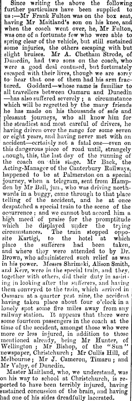 Since writing the above the following further particulars have been supplied to us : —Mr Frank Pulton was on the box seat, having Mr Maitland's son on his knee, and when the coach went over, he, Mr Fulton, was one of a fortunate few who were able to spring clear of the vehicle, but still sustained some injuries, the others escaping with but slight bruises. Mr A. Chetham Strode, of Dunedin, had two sons on the coach, who were a good deal contused, but fortunately escaped with their lives, though we are sorry to hear that one of them had his arm fractured. Goddard—whose name is familiar to all travellers between Oamaru and Dunedin —has also suffered severely ; a circumstance which will be regretted by the many friends he has made on his thousands of safe and pleasant journeys, who all know him for the steadiest and most careful of drivers, he having driven over the range for some seven or eight years, and having never met with an accident—certainly not a fatal one—even on this dangerous piece of road until, strangely pnough, this, the last day of the running of the coach on this sfcuge. Mr Back, the Acting-Manager of the Canterbury Railways, happened to be at Palmerston on a special journey, when a telegram, sent from Hampden by Mr Bell, jim., who was driving northwards in a buggy, came through to that place telling of the accident, and he at once despatched a special train to the scene of the occurrence ; and we cannot but accord him a high meed of praise for the promptitude which he displayed under the trying circumstances. The train stopped opposite Kartigi, to the hotel at which place the sufferers had been taken, and yhere thoy were attended to by Dr. Brown, who administered such relief as was in his power. Messrs Shrimski, Alison Smith, and Kerr, were in (lie special train, and they. together with others, did their duty in assisting in looking after the sufferers, and having them conveyed to the train, which arrived in Oamaru at a quarter pr.st. nine, the accident having taken place about four o'clock in a lonely spot some Jive miles away from any railway station. It appears that there were some fourteen passengers in the coach at the time of the accident, amongst those who were more or less injured, in addition to those mentioned already, being Mr Hunter, of Wellington ; Mr Bishop, of the "Sun" newspaper, Christchurch ; Mr Cullis Hill, of Melbourne; Mr J. Cameron, Timaru ; and Mr Valpy, of Dunedin. Master Maitland, who, we understand, was on his way to school at Christchurch, is reported to have been terribly injured, having sustained concussion of the brain, and having had one of his sides dreadfully lacerated.