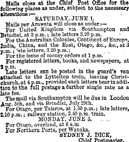 Mails close at the Chief Post Office for the following places as under, subject to the neoessary alterations : SATURDAY, JUNE 1. Mails per Arawata will close as under i For United Kingdom via Southampton and Brindisi, at 3 p.m.; late letters 3.20 p.m. For the Australian Colonies, Continent ofEurop", India, China, and the East, Otago, &c, &c.,at3 p.m.; 'ite letters, 3.20 p.m.: For the issne of money orders at 1 p.m. For registered letters, books, and newspapers, at 2 p.m. Late letters can be posted in the guard's van attached to the Lyttelton train, leaving Christchurch, at 4 p.m., provided such letters bearinaddi. tion to the full postage a further single rate as a late fee. The mail via Southampton will be due in London Aug. sth, and via Brindisi, July 29th. For Otago, per Taiaroa, at 1.50 p.m.; late letters, 2.10 p.m.; railway station, 2.40 p.m. train. MONDAY, JUNE 3. For Otago, overland, at 6 a.m For Northern Torts, per Wanaka. SYDNEY J. DICK, Chief Postmaster.