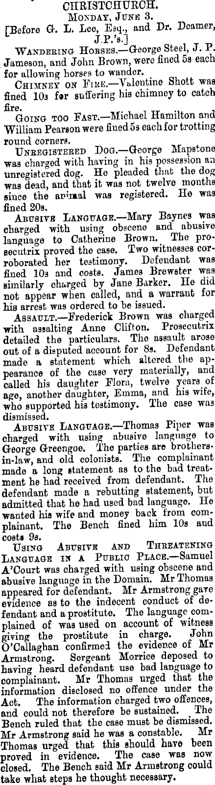 CIIKI3TCHUKCH. Monday, June 3. TBefore G. L. Lee, Esq., and Dr. Deamer, JP.'s.] Wandering Houses— George Steel, J. P. Jameson, and John Brown, were fined 5s each for allowing horses to wander. Chimney on Fieb.—Valentine Shott was fined 103 f»r suffering his chimney to catch fire. Going too Fast.—Michael Hamilton and William Pearson were fined 03 each for trotting round corners. Unregistered Dog.—George Mapstone was charged with having in his possession an unregistered dog. He pleaded that the dog was dead, and that it was not twelve months since the animal was registered. He was fined 20s. Abusive Language.—Mary Baynes was charged with using obscene and abusive language to Catherine Brown. The prosecutrix proved the case. Two witnesses corroborated her testimony. Defendant was fined 10s and costs. James Brewster was similarly charged by Jane Barker. He did not appear when called, and a warrant for his arrest was ordered to be issued. Assault— Frederick Brown was charged with assalting Anne Clifton. Prosecutrix detailed the particulars. The assault arose out of a disputed account for Bs. Defendant made a statement which altered the appearance of the case very materially, and called his daughter Flora, twelve years of age, another daughter, Emma, and his wife, who supported his tostimony. The case was dismissed. Abusive Language.—Thomas Piper was charged with using abusive language to George Greengoe. The parties are brothers-in-law, and old colonists. The complainant made a long statement as to the bad treatment he had received from defendant. The defendant made a rebutting statement, but admitted that he had used bad language. He wanted his wife and money back from complainant. The Bench fined him 10s and costs 9s. Using Abusive and Threatening Language in a Public Place.—Samuel A'Court was charged with using obscene and abusive language in the Domain. Mr Thomas appeared for defendant. Mr Armstrong gave evidence as to the indecent conduct of defendant and a prostitute. The language complained of was used on account of witness giving the prostitute in charge. John O'Callaghan confirmed the evidence of Mr Armstrong. Sergeant Morrice deposed to having heard defendant use bad language to complainant. Mr Thomas urged that the information disclosed no offence under the Act. The information charged two offences, and could not therefore be sustained. The Bench ruled that the case must be dismissed. Mr Armstrong said he was a constable. Mr Thomas urged that this should have been proved in evidence. The case was now closed. The Bench said Mr Armstrong could take what steps he thought necessary.