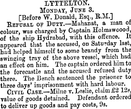 LYTTELTON. Monday, June 3. [Before W. Donald, Esq., R.M.] Refusal of Duty.—Mahanat, a man of colour, was charged by Captain Holmswoood, of the ship Hydrabad, with this offence. It appeared that the accused, on Saturday last, had helped himself to some brandy from the swinging tray of the above vessel, which had an effect on him. The captain ordered him to the forecastle and the accused refused duty there. The Bench sentenced the prisoner to three days' imprisonment with hard labour. Civil Case.—Milno v. Leslie, claim £2 12s, value of goods detained. Defendant ordered to deliver up goods and pay costs, 9s.