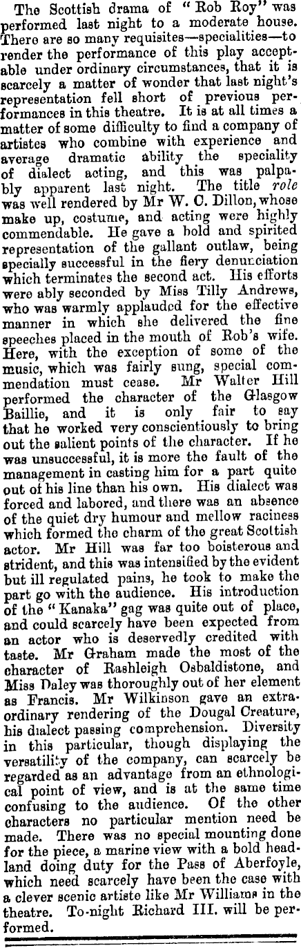 The Scottish drama of “ Rob Roy” was performed last night to a moderate house. There are so many requisites—specialities—to render the performance of this play acceptable under ordinary circumstances, that it is scarcely a matter of wonder that last night’s representation fell short of previous performances in this theatre. It is at all times a matter of some difficulty to find a company of artistes who combine with experience _ and average dramatic ability the speciality of dialect acting, and this was palpably apparent last night. The title role was well rendered by Mr W. 0. Dillon, whoso make up, costume, and acting were highly commendable. He gave a hold and spirited representation of the gallant outlaw, being specially successful in the fiery denunciation which terminates the second act. His efforts were ably seconded by Miss Tilly Andrews, who was warmly applauded for the effective manner in which she delivered the fine speeches placed in the mouth of Rob’s wife. Here, with the exception of some of the music, which was fairly sung, special commendation must cease. Mr Walter Hill performed the character of the Glasgow Baillie, and it is only fair to say that he worked very conscientiously to bring out the salient points of the character. If ho was unsuccessful, it is more the fault of the management in casting him for a part quite out of his line than his own. His dialect was forced and labored, and there was an absence of the quiet dry humour and mellow raciness which formed the charm of the great Scottish actor. Mr Hill was far too boisterous and strident, and this was intensified by the evident but ill regulated pains, he took to make the part go with the audience. His introduction of the “ Kanaka” gag was quite out of place, and could scarcely have been expected from an actor who is deservedly credited with taste. Mr Graham made the most of the character of Rashleigh Osbaldistone, and Miss Daley was thoroughly out of her element as Francis. Mr Wilkinson gave an extraordinary rendering of the Dougal Creature, his dialect passing comprehension. Diversity in this particular, though displaying the versatility of the company, can scarcely bo regardedas an advantage from an ethnological point of view, and is at the same time confusing to the audience. Of the other characters no particular mention need be made. There was no special mounting done for the piece, a marine view with a bold headland doing duty for the Pass of Aberfoyle, which need scarcely have been the case with a clever scenic artiste like Mr Williams in the theatre. To-night Richard 111. will be performed.