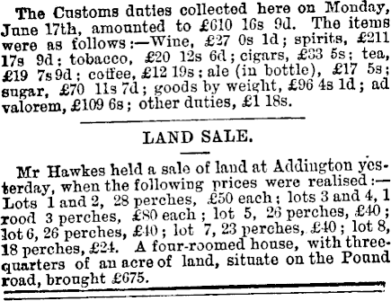 The Customs duties collected here on Monday, Jnne 17th, amounted to £6lO 16s 9d. The items were as follows :-Wiue, £27 0s Id; spinta, £2ll 17s 9d; tobacco, £2O 12s 6d; cigars, £o3 5s ;; tea, £l9 7s9d; coffee. £l2 19s : ale (in bottle), £l7 os ; sugar, £7O 11s 7d; goods by weight, £96 4s Id ; ad valorem, £lO9 6s; other duties, £llßs. LAND SALE. Mr Hawkes held a sale of laud at Addington yesterday, when the following prices were realised : Lots laud 2, 28 perches, £SO each ; lots 3 and 4, 1 rood 3 perches, £3O each ; lot 5,2 o perches, £4OG lot 6, 26 perches, £4O ; lot /, 23 perches, £4O ; lot 8, 18 perches, £24. A four-roomed house, with threequarters of an acre of land, situate on the Pound road, brought £675.