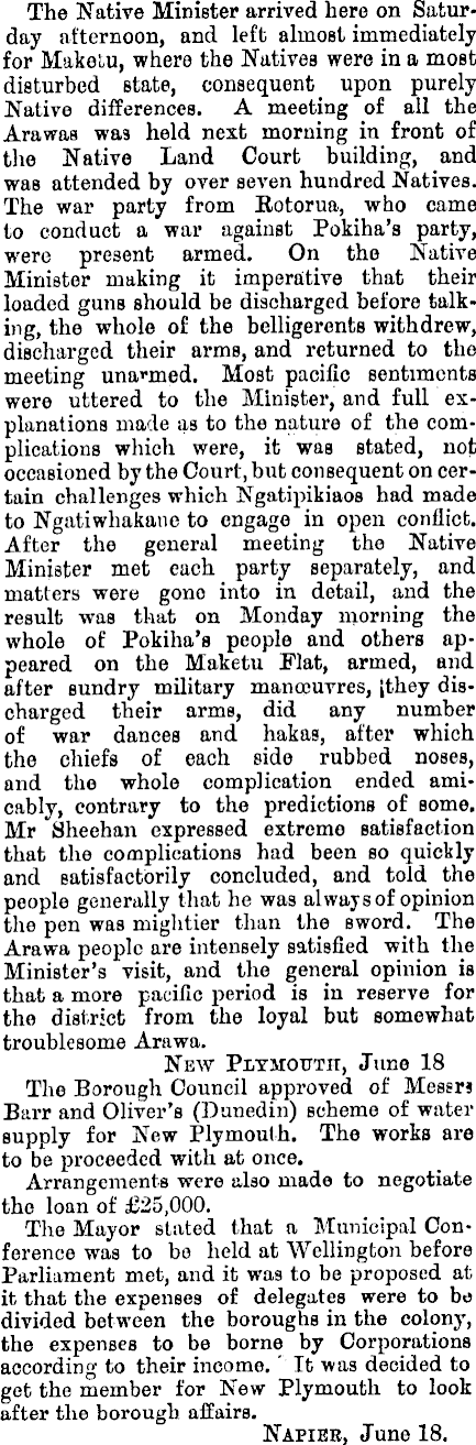 The Native Minister arrived here on Saturday afternoon, and left almost immediately for Makotu, where tho Natives were in a most disturbed state, consequent upon purely Native differences. A meeting of all the Arawas was hold next morning in front of the Native Land Court building, and was attended by over seven hundred Natives. The war party from Eotorua, who came to conduct a war against Pokiha’s party, were present armed. On the Native Minister making it imperative that their loaded guns should be discharged before talking, the whole of the belligerents withdrew, discharged their arms, and returned to tho meeting unarmed. Most pacific sentiments were uttered to the Minister, and full explanations made as to the nature of the complications which were, it was stated, not occasioned by the Court, but consequent on certain challenges which Ngatipikiaos had made to Ngatiwhakanc to engage in open conflict. After the general meeting the Native Minister met each party separately, and matters were gone into in detail, and the result w-as that on Monday morning the whole of Pokiha’s people and others appeared on the Maketu Flat, armed, and after sundry military manoeuvres, [they discharged their arms, did any number of war dances and hakas, after which the chiefs of each side rubbed noses, and the whole complication ended amicably, contrary to the predictions of some. Mr Sheehan expressed extreme satisfaction that the complications had been so quickly and satisfactorily concluded, and told the people generally that he was always of opinion tho pen was mightier than the sword. The Arawa people are intensely satisfied with the Minister’s visit, and the general opinion is that a more pacific period is in reserve for the district from the loyal but somewhat troublesome Arawa. New Plymouth, June 18 The Borough Council approved of Messrs Barr and Oliver’s (Dunedin) scheme of water supply for New Plymouth. The works are to be proceeded with at once. Arrangements were also made to negotiate the loan of £25,000. The Mayor stated that a Municipal Conference was to be held at Wellington before Parliament met, and it was to be proposed at it that the expenses of delegates were to be divided between the boroughs in the colony-, the expenses to be borne by Corporations according to their income. It was decided to get the member for New Plymouth to look after the borough affairs. Napier, June 18.