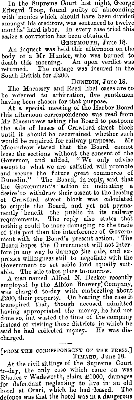 In the Supreme Court last night, George Edward Toop, found guilty of absconding with monies which should have been divided amongst his creditors, "was sentenced to twelve months’ bal’d labor. In every case tried this assize a conviction has been obtained. Greymouth, Juno 18. An inquest was held this afternoon on the body of a Mr Hunter, who was burned to death this morning. An open verdict was returned. The cottage was insured in the South British for £2OO. Dunedin, June 18. The Macassey and Reed libel cases are to be referred to arbitration, five gentlemen having been chosen for that purpose. At a special meeting of the Harbor Board this afternoon correspondence was read from Mr Macandrew asking the Board to postpone the sale of leases of Crawford street block until it should be ascertained whether such would be required for railway purposes. Mr Macandrew stated that the Board cannot lease the sections without the consent of the Governor, and added, “ We only advise assent to what we are satisfied will promote and secure the future great commerce of Dunedin,” The Board, in reply, said that the Government’s action in indicating a desire’to withdraw their assent to the leasing of Crawford street block was calculated to cripple the Board, and yet not permanently ' benefit the public in its railway requirements. The reply also states that nothing could bo more damaging to the trade of this port than the interference of 1 Government with the Board’s present action. ' The Board hopes the Government will not interfere in any way to damage the sale, and expresses willingness still to negotiate with the Government to set aside land equally suitable, The sale takes place to-morrow. A man named Alfred N. Decker recently employed by the Albion Brewery* Company, was charged to-day with embezzling about £2OO, their property. On hearing the case it transpired that, though accused admitted having appropriated the money, he had not done so, but wasted the time of the company instead of visiting those districts in which he said he had collected money. He was discharged. [I'ROM THE CORRESPONDENT OF THE PRESS.] Timaeu, June 18. At the civil sittings of the Supreme Court to-day, the only case which came on was Rhodes v Wadsworth, claim £IOOO, damages for defendant; neglecting to live in an old hotel at Orari, which ho had leased. The defence was that the hotel was in a dangerous