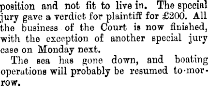 position and not fit to live in. The special jury gave a verdict for plaintiff for £3OO. All the business of the Court is now finished, with the exception of another special jury case on Monday next. The sea has gone down, and boating operations will probably be resumed to-mor-row.
