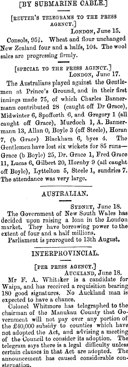 [BY SUBMARINE CABLE.] [EEUTEE’S TELEGEAMB TO THE PEES 3 AGENCY.] London, Juno 15. Consols, 95a 1 . Wheat and Hour unchanged New Zealand four and a halfs, 104, The wool sales arc progressing firmly. [special to the peess agency.] London, June 17. Tire Australians played against the Gentlemen at Prince’s Ground, and in their first innings made 75, of which Charles Bannermann contributed 28 (caught off Dr Grace), Midwinter 6, Spofforth G, and Gregory 1 (all caught off Grace), Murdoch 1, A. Bannermann 13, Allan 0, Boyle 3 (off Steele), Horan 7, (b Grace) Blackham 6, byes 4. The Gentlemen have lost six wickets for 85 runs— Grace (b Boyle) 25, Dr. Grace 1, Fred Grace 11, Lucas 6, Gilbert 20, Hornby 9 (ail caught off Boyle), Lyttelton 5, Steele 1, sundries 7. The attendance was very large. AUSTRALIAN. Sydney, June 18. The Government of New South Wales has decided upon raising a loan in the London market. They have borrowing power to the extent of four and a half millions. Parliament is prorogued to 13th August, INTERPROYINCIAL. [pee peess agency.] Auckland, June 18. Mr F. A. Whitaker is a candidate for Waipa, and has received a requisition bearing 180 good signatures. No Auckland man is expected to have a chance. , Colonel Whitmore lias telegraphed to the chairman of the Manukau County that Government will not pay over any portion of the £40,000 subsidy to counties which have not adopted the Act, and advising a meeting of the Council to consider its adoption. The telegram says there is a legal difficulty unless certain clauses in that Act are adopted. The announcement has caused considerable consternation.