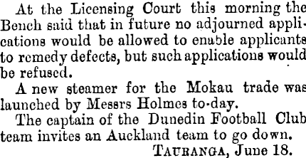 At the Licensing Court this morning the Bench said that in future no adjourned applications would be allowed to enable applicants to remedy defects, but such applications would be refused. A now steamer for tho Mokau trade was launched by Messrs Holmes to-day. The captain of the Dunedin Football Club team invites an Auckland team to go down. Tatjbanga, June 18.