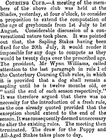 Coubsing Cxub. — A meeting of the members of the above club was held at the Shades, yesterday, at four o’clock, to consider a proposition to extend the computation of the age of greyhounds from Ist July to Ist August. Considerable discussion of a conversational nature took place. It was pointed out that, the Sapling Stakes having been fixed for the 20th July, it would render it impossible for any dogs to compete as they would be twenty days over the prescribed age. The president, Mr Wynn Williams, called attention to the last paragraph in rule 1 of the Canterbury Coursing Club rules, in which it is provided that a dog shall remain a sapling until he is twelve months old, or “ until the end of each season respectively.” It was therefore argued that there was no necessity for the introduction of a fresh rule, as the one already quoted provided that the exception should extend to the end of the season. It was consequently deemed unnecessary to alter the existing rules. The meeting then terminated. The draw for the Puppy and All-Aged Stakes takes place to day.