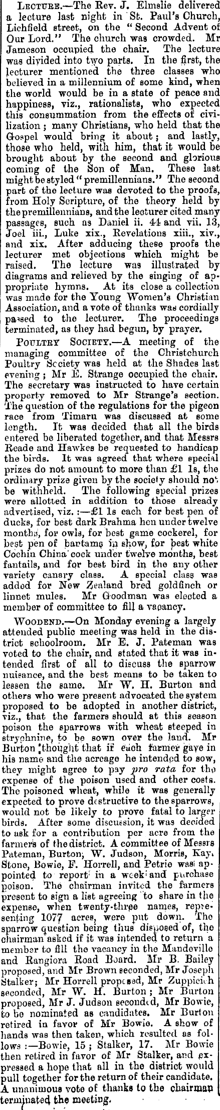Lectuee. —The Rev. J. Elmslie delivered a lecture last night in St. Paul’s Church, Lichfield street, on the “ Second Advent of Our Lord.” The church was crowded. Mr Jameson occupied the chair. The lecture was divided into two parts. In the first, the lecturer mentioned the three classes who believed in a millennium of some kind, when the world would be in a state of peace and happiness, viz., rationalists, who expected this consummation from the effects of civilization ; many Christians, who held that the Gospel would bring it about; and lastly, those who held, with him, that it would be brought about by the second and glorious coming of the Son of Man. These last might be styled “premillennians.” The second part of the lecture was devoted to the proofs, from Holy Scripture, of the theory held by thepremillenniaus, and the lecturer cited many passages, such as Daniel ii. 44 and vii. 13, Joel iii., Luke xix., Revelations xiii., xiv., and xix. After adducing these proofs the lecturer met objections which might be raised. The lecture was illustrated by diagrams and relieved by the singing of appropriate hymns. At its close a collection was made for the Young Women’s Christian Association, and a vote of thanks was cordially parsed to the lecturer. The proceedings terminated, as they had begun, by prayer. Poultry Society. —A meeting of the managing committee of the Christchurch Poultry Society was held at the Shades last evening ; Mr E. Strange occupied the chair. The secretary was instructed to have certain property removed to Mr Strange’s section. The question of the regulations for the pigeon race from Timaru was discussed at some length. It was decided that all the birds entered bo liberated together, and that Messrs Roade and Hawkes be requested to handicap the birds. It was agreed that where special prizes do not amount to more than £1 Is, the ordinary prize given by the society should not be withheld. The following special prizes were allotted in addition to those already advertised, viz. : —£l Is each for best pen of ducks, for best dark Brahma hen under twelve month a, for owls, for best game cockerel, for best pen of bantams in show, for best white Cochin China cock under twelve months, best fantails, and for best bird in the any other variety canary class. A special class was added for New Zealand bred goldfinch or linnet mules. Mr Goodman was elected a member of committee to fill a vacancy. Woodend. —On Monday evening a largely attended public meeting was held in the district schoolroom. Mr E. J, Pateman was voted to the chair, and stated that it was intended first of all to discuss the sparrow nuisance, and the best means to be taken to lessen the same. Mr W. H. Burton and others who were present advocated the system proposed to be adopted in another district, viz., that the farmers should at this season poison the sparrows with wheat steeped in strychnine, to be sown over the land, Mr Burton | thought that if efioh farmer gaye in his name and the acreage he intended to sow, they might agree to pay pro rata for the expense of the poison used and other costs. The poisoned wheat, while it was generally expected to prove destructive to the sparrows, would not be likely to prove fatal to larger birds. After some discussion, it was decided to ask for a contribution per acre from the farmers of the district. A committee of Messrs Pateman, Burton, W. Judson, Morris, Kay. Stone, Bowie, F. Horrell, and Petrie was: appointed to report in a week and purchase poison. The chairman invited the farmers present to sign a list agreeing to share in the expense, when twenty-thrpe names, representing 1077 acres, were put down. The sparrow question being thus disposed of, the chairman asked if it was intended to return a member to fill the vacancy in the Mandovillo and Rangiora Road Board. Mr B. Bailey proposed, and Mr Brown seconded, Mr Joseph stalker; Mr Horrcdl proposed, Mr Zuppiciih seconded, Mr W. H. Burton ; Mr Burton proposed, Mr J. Judson seconded, Mr Bowie, to bo nominated as candidates. Mr Burton retired in favor of Mr Bowie. A show of hands was then taken, which resulted as follows Bowie, 15 ; Stalker, 17. Mr Bowie then retired in favor of Mr Stalker, and expressed a hope that all in the district would pull together for the return of their candidate. A unanimous vote of thanks to the chairman terminated the meeting.