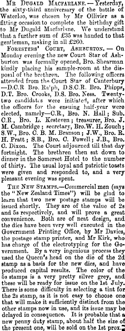 Mr Dugald Macfariane. ~ Yesterday, the sixty-third anniversary of the battle of Waterloo, was chosen by Mr Ollivier as a fitting occasion to complete the birthday gift to Mr Dngald Macfarlane. We understand that a further sum of £35 was handed to that gentleman, making in all £260. Foresters’ Court, Ashburton. On Monday evening the new Court Star of Ashburton was formally opened, Bro. Shearman kindly placing his sample-room at the disposal of the brethren. The following officers attended from the Court Star of Canterbury —D.C.R Bro Ralph, D.S.O.R Bro. Phipps, D.T. Bro. Crooks, D.S. Bro. Ness. Twentytwo candidates were initiated, after which the officers for the ensuing half-year were elected, namely—C.R., Bro. N. Mail; Sub. C.R , Bro. L. Kesteven ; treasurer, Bro. J. M. Cambridge ; secretary, Bro.W. 11. Zouch; S.W., Bro. C. B. M. Branson; J.W., Bro. R. H. Pratt; 5.8., Bro. C. Powell; J. 8., Bro. C. Dixon. The Court adjourned till that day fortnight. The brethren then sat down to dinner in the Somerset Hotel to the number of thirty. The usual loyal and patriotic toasts were given and responded to, and a very pleasant evening was spent. The New Stamps. —Commercial men (says the “ New Zealand Times”) will be glad to learn that two new postage stamps will be issued shortly. They are of the value of 2s and 5s respectively, and will prove a great convenience. Both are of neat design, and the dies have been very well executed in the Government Printing Office, by Mr Davies, the postage stamp printer, and Mr Kirk, who has charge of the electrotyping for the Government. By a very ingenious process they used the Queen’s head on the die of the 2d stamp as a basis for the new dies, and have produced capital results. The color of the 5s stamps is a very pretty silver grey, and these will be ready for issue on the Ist July. There is some difficulty in selecting a tint for the 2s stamp, as it is not easy to choose one that will make it sufficiently distinct from the other stamps now in use, and its issue may be delayed in consequence. It is probable that a new penny duty stamp, about half the size of the present one, will be sold on the Ist prox.JJ
