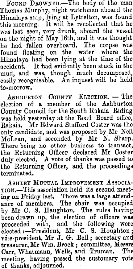 Found Drowned. —The body of the man Thomas Murphy, night watchman aboard the Himalaya ship, lying at Lyttelton, was found this morning. It will be recollected that he was last seen, very drunk, aboard the vessel on the night of May 16th, and it was thought he had fallen overboard. The corpse was found floating on the water where the Himalaya had been lying at the time of the accident. It had evidently been stuck in the mud, and was, though much decomposed, easily recognisable. An inquest will be held to-morrow. Ashburton County Election. The election of a member of the Ashburton County Council for the South Rakaia Riding was held yesterday at the Road Board office, Rakaia. Mr Edward Stafford Coster was the only candidate, and was proposed by Mr Neil McLean, and seconded by Mr N. Sharp. There being no other business to transact, the Returning Officer declared Mr Coster duly elected. A vote of thanks was passed to the Returning Officer, and the proceedings terminated. Ashley Mutual Improvement Association. —This association held its second meeting on Friday last. There was a large attendance of members. The chair was occupied by Mr C. S. Haughton. The rules having been drawn up, the election of officers was proceeded with, and the following were elected : —President, Mr C. S. Houghton ; vLe-president, Mr J. G. Bell; secretary and treasurer, Mr Wm. Brock ; committee, Messrs Carr, Whatmaun, Wells, and Truman. The meeting, having passed the customary vote of thanks, adjourned.