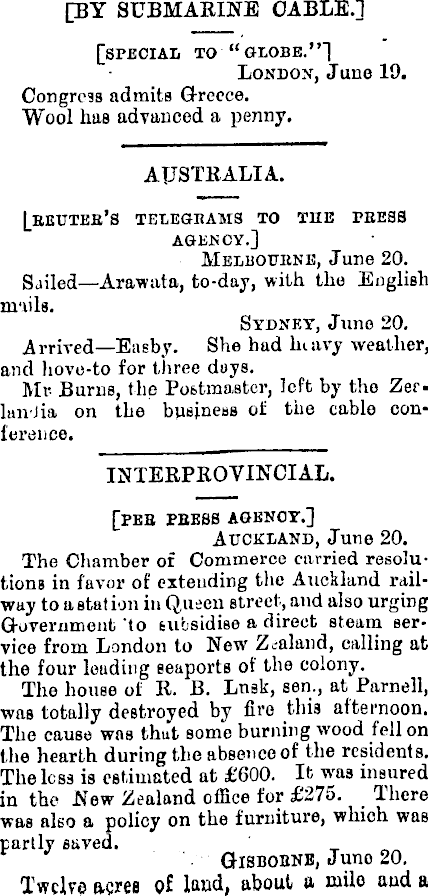 [BY SUBMARINE CABLE.] [special to “globe.”] London, Juue 19. Congress admits Greece. Wool has advanced a penny. AUSTRALIA. [eeutee’s telegeams to tub pbess agency.] Melbouene, June 20. Sailed —Arawata, to-day, with the English mails. Sydney, June 20. Arrived—Easby. She had luavy weather, and hove-to for three days. Mr Burns, the Postmaster, left by the Zerlandia on the business of the cable conference. INTERPROYINCIAL. [pee peebs agency.] Auckland, June 20. The Chamber of Commerce carried resolutions in favor of extending the Auckland railway to a station in Queen street, and also urging Government to subsidise a direct steam service from London to New Zealand, calling at the four leading seaports of the colony. The house of R. B. Lusk, sen., at Parnell, was totally destroyed by fire this afternoon. The cause was that some burning wood fell on the hearth during the absence of the residents. The less is estimated at £6OO. It was insured in the New Zealand office for £275. _ There was also a policy on the furniture, which was partly saved. GISBOBNB, Juno 20. Twelve ftoree of laud, about a iuilo and a