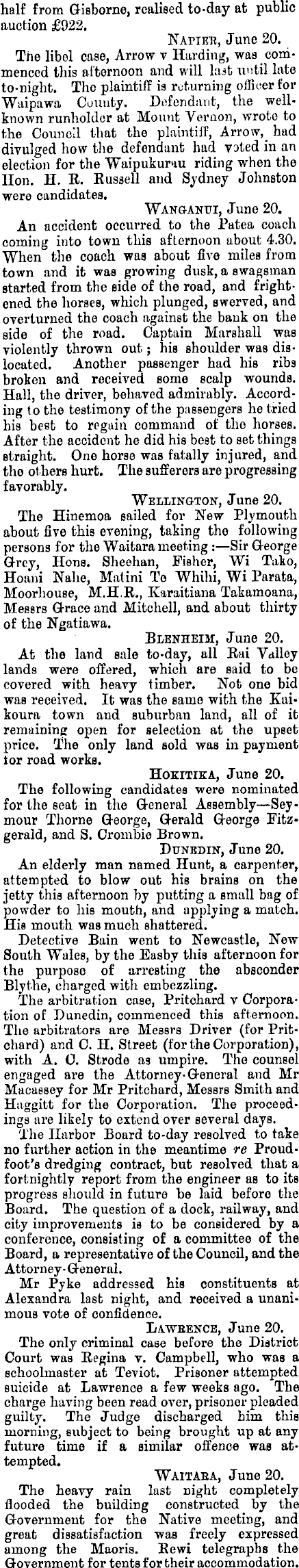 half from Gisborne, realised to-day at public auction £922. Napier, June 20. The libel case, Arrow v Harding, was commenced this afternoon and will last until late to-night. Tho plaintiff is returning officer for Waipawa County. Defendant, the wellknown runholder at Mount Vernon, wrote to tho Council that the plaintiff, had divulged how the defendant had voted in an election for the Waipukurau riding when the Hon. H. R. Russell and Sydney Johnston were candidates. Wanganui, June 20. An accident occurred to the Patea coach coming into town this afternoon about 4.30. When the coach was about five miles from town and it was growing dusk, a swagsman started from the side of the road, and frightened the horses, which plunged, swerved, and overturned the coach against the bank on the side of the road. Captain Marshall was violently thrown out; his shoulder was dislocated. Another passenger had his ribs broken and received some scalp wounds. Hall, the driver, behaved admirably. According to the testimony of the passengers he tried his beet to regain command of the horses. After the accident he did his best to set things straight. One horse was fatally injured, and tho others hurt. The sufferers are progressing favorably. Wellington, June 20. The Hinemoa sailed for New Plymouth about five this evening, taking tho following persons for the Waitara meeting : —Sir George Grey, Hons. Sheehan, Fisher, Wi Tako, Hoani Nahe, Matini Te Whihi, Wi Parata, Moorhouse, M.H.R., Karaitiana Takamoana, Messrs Grace and Mitchell, and about thirty of the Ngatiawa. Blenheim, June 20. At the land sale to-day, all Rai Valley lands were offered, which are said to be covered with heavy timber. Not one bid was received. It was tho same with the Kuikoura town and suburban land, all of it remaining open for selection at tho upset price. The only land sold was in payment tor road works. Hokitika, June 20. The following candidates were nominated for the seat in the General Assembly—-Sey-mour Thorne George, Gerald George Fitzgerald, and S. Crombie Brown. Dunedin, June 20, An elderly man named Hunt, a carpenter, attempted to blow out his brains on the jetty this afternoon by putting a small bag of powder to his mouth, and applying a match. His mouth was much shattered. Detective Bain went to Newcastle, Now South Wales, by the Easby this afternoon for the purpose of arresting the absconder Blythe, charged with embezzling. The arbitration case, Pritchard v Corporation of Dunedin, commenced this afternoon. The arbitrators are Messrs Driver (for Pritchard) and C. 11. Street (for the Corporation), with A. C. Strode as umpire. The counsel engaged ai’e the Attorney-General and Mr Macassey for Mr Pritchard, Messrs Smith and Haggitt for the Corporation. The proceedings are likely to extend over several days. The Harbor Board to-day resolved to take no further action in the meantime re Proudfoot’s dredging contract, but resolved that a fortnightly report from the engineer as to its progress should in future be laid before the Board. The question of a dock, railway, and city improvements is to be considered by a conference, consisting of a committee of the Board, a representative of the Council, and the Attorney • General. Mr Pyke addressed his constituents at Alexandra last night, and received a unanimous vote of confidence. Lawrence, June 20. The only criminal case before the District Court was Regina v. Campbell, who was a schoolmaster at Teviot. Prisoner attempted suicide at Lawrence a few weeks ago. The charge having been read over, prisoner pleaded guilty. The Judge discharged him this morning, subject to being brought up at any future time if a similar offence was attempted. Waitara, June 20. The heavy rain last night completely flooded the building constructed by the Government for tho Native meeting, and great dissatisfaction was freely expressed among the Maoris. Eewi telegraphs the Government for tents for their accommodation.
