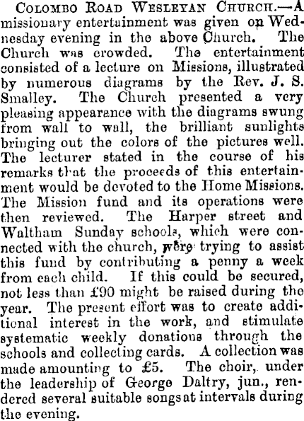 Colombo Road Wesleyan Church. —A missionary entertainment was given on Wednesday evening in the above Church. The Church was crowded. The entertainment consisted of a lecture on Missions, illustrated by numerous diagrams by the Rev. J. S. Smalley. The Church presented a very pleasing appearance with the diagrams swung from waif to wall, the brilliant sunlights bringing out the colors of the pictures well. The lecturer stated in the course of bis remarks that the proceeds of this entertainment would be devoted to the Homo Missions. The Mission fund and its operations wore then reviewed. The Harper street and Waltham Sunday schools, which were connected with the church, trying to assist this fund by contributing a penny a week from each child. If this could bo secured, not less than £9O might be raised during the year. The present effort was to create additional interest in the work, and stimulate systematic weekly donations through the schools and collecting cards. A collection was made amounting to £5. The choir, under the leadership of George Daltry, jun., rendered several suitable songs at intervals during the evening.