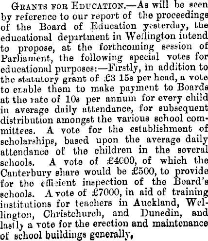 Geants eoe Education.—As will be seen by reference to our report of the proceedings of the Board of Education yesterday, the educational department in Wellington intend to propose, at the forthcoming session of Parliament, the following special votes for educational purposes: —Firstly, in addition to the statutory grant of £3 15s per head, a vot e to enable them to make payment to Boards at the rate of 10s per annum for every child in average daily attendance, for subsequent distribution amongst the various school committees. A vote for the establishment of scholarships, based upon the average daily attendance of the children in the several schools. A vote of £4OOO, of which the Canterbury share would be £SOO, to provide for the efficient inspection of the Board’s schools. A vote of £7OOO, in aid of training institutions for teachers in Auckland, Wellington, Christchurch, and Dunedin, and last 1 y a vote for the erection and maintenance of school buildings generally,
