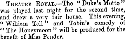 Theatre Royal. — The “ Duke’s Motto ” was played last night for the second time, and drew a very fair house. This evening, “William Tell” and Tobin’s comedy of “ The Honeymoon ” will be produced for the benefit of Miss Pender.