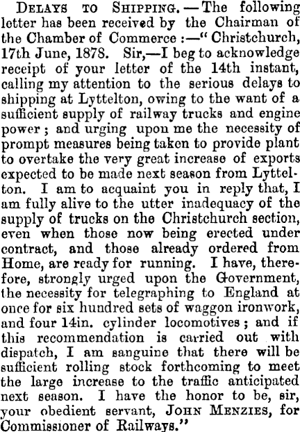Delays to Shipping. —The following letter has been received by the Chairman of the Chamber of Commerce :—“ Christchurch, 17th June, 187 S. Sir, —I beg to acknowledge receipt of your letter of the 14th instant, calling my attention to the serious delays to shipping at Lyttelton, owing to the want of a sufficient supply of railway trucks and engine power ; and urging upou me the necessity of prompt measures being taken to provide plant to overtake the very great increase of exports expected to be made next season from Lyttelton. I am to acquaint you in reply that, I am fully alive to the utter inadequacy of the supply of trucks on the Christchurch section, even when those now being erected under contract, and those already ordered from Home, are ready for running. I have, therefore, strongly urged upon the Government, the necessity for telegraphing to England at once for six hundred sets of waggon ironwork, and four 14in. cylinder locomotives ; and if this recommendation is carried out with dispatch, I am sanguine that there will be sufficient rolling stock forthcoming to meet the largo increase to the traffic anticipated next season. I have the honor to be, sir, your obedient servant, John Menzies, for Commissioner of Eailways.”