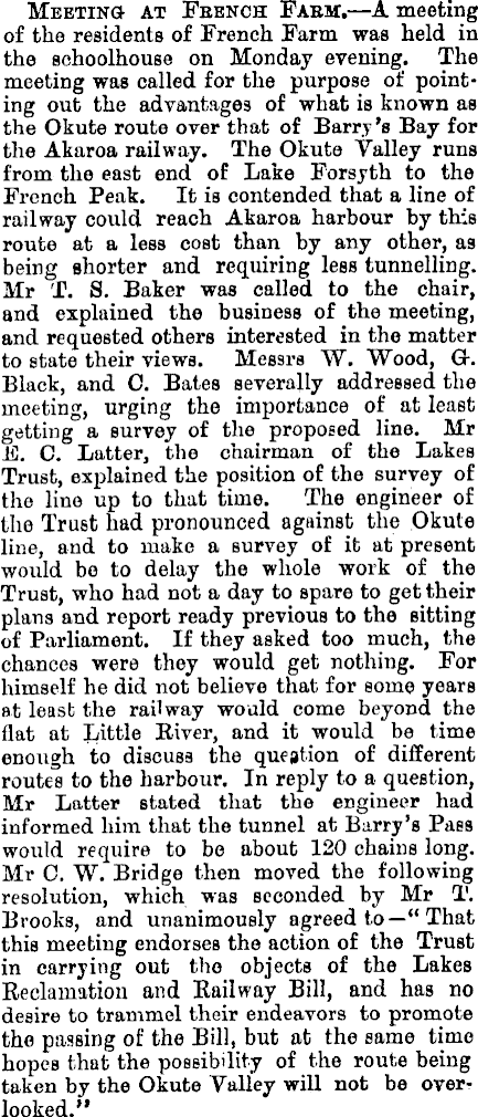 Meeting! at French Farm:. — A meeting of the residents of French Farm was held in the schoolhouse on Monday evening. The meeting was called for the purpose of pointing out the advantages of what is known as the Okute route over that of Barry’s Bay for the Akaroa railway. The Okute Valley runs from the east end of Lake Forsyth to the French Peak. It is contended that a line of railway could reach Akaroa harbour by this route at a less cost than by any other, as being shorter and requiring less tunnelling. Mr T. S. Baker was called to the chair, and explained the business of the meeting, and requested others interested in the matter to state their views. Messrs W. Wood, G. Black, and C. Bates severally addressed the meeting, urging the importance of at least getting a survey of the proposed line. Mr E. C. Latter, the chairman of the Lakes Trust, explained the position of the survey of the line up to that time. The engineer of the Trust had pronounced against the Okute line, and to make a survey of it at present would be to delay the whole work of the Trust, who had not a day to spare to get their plans and report ready previous to the sitting of Parliament. If they asked too much, the chances were they would get nothing. For himself he did not believe that for some years at least the railway would come beyond the flat at Little River, and it would be time enough to discuss the question of different routes to the harbour. In reply to a question, Mr Latter stated that the engineer had informed him that the tunnel at Barry’s Pass would require to be about 120 chains long. Mr C. W. Bridge then moved the following resolution, which was seconded by Mr T. Brooks, and unanimously agreed to— “ That this meeting endorses the action of the Trust in carrying out the objects of the Lakes Reclamation and Railway Bill, and has no desire to trammel their endeavors to promote the passing of the Bill, but at the same time hopes that the possibility of the route being taken by the Okute Valley will not be overlooked.”