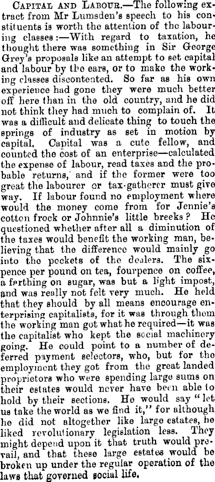 Capital and Labour. —The following extract from Mr Lumsden’s speech to his constituents is worth the attention of the labouring classes :—With regard to taxation, he thought there was something in Sir George Grey’s proposals like an attempt to set capital and labour by the ears, or to make the working classes discontented. So far as his own experience had gone they were much better off here than in the old country, and he did not think they had much to complain of. It was a difficult and delicate thing to touch the springs of industry as set in motion by capital. Capital was a cute fellow, and counted the cost of an enterprise —calculated the expense of labour, read taxes and the probable returns, and if the former were too great the labourer cr tax-gatherer must give way. If labour found no employment where would the money come from for Jennie’s cotton frock or Johnnie’s little breeks P Ho questioned whether after all a diminution of the taxes would benefit the working man, believing that the difference would mainly go into the pockets of the dealers. The sixpence per pound on tea, fourpence on coffee, a farthing on sugar, was but a light impost, and was really not felt very much. Ho held that they should by all means encourage enterprising capitalists, for it was through them the working man got what ho required—it was the capitalist who kept the social machinery going. He could point to a number of deferred payment selectors, who, but tor the employment they got from the great landed proprietors who were spending largo sums on their estates would never have been able to hold by their sections. Ho would say “ let us take the world as we find it,” for although he did not altogether like large estates, ho liked revolutionary legislation less. They might depend upon it that truth would prevail, and that these largo estates would bo broken up under the regular operation of the laws that governed social life.