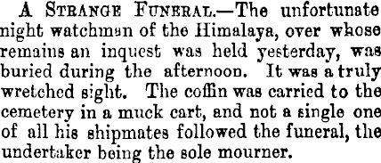 A Strange Funeral— The unfortunate night watchman of the Himalaya, over whose remains an inquest was held yesterday, was buried during the afternoon. It was a truly wretched sight. The coffin was carried to the cemetery in a muck cart, and not a single one of all his shipmates followed the funeral, the undertaker being the sole mourner.