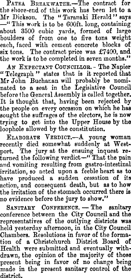 Patea Breakwater. —The contract for the shore-end of this work has been let to a Mr Dickson. The “Taranaki Herald’’says —“ This work is to be 600 ft. long, containing about 3500 cubic yards, formed of large boulders of from one to five tons weight each, faced with cement concrete blocks of six tons. The contract price was £7400, and the work is to be completed in seven months.” An Expectant Councillor. - The Napier “Telegraph” states that is it reported that Mr John Buchanan will probably be nominated to a seat in the Legislative Council before the General Assembly is called together. It is thought that, having been rejected by the people on every occasion on which he has sought the suffrages of the electors, he is now trying to get into the Upper House by the loophole allowed by the constitution. Elaborate Verdict,-— A young woman recently died somewhat suddenly at Westport. The jury at the ensuing inquest returned the following verdict—" That the pain and vomiting resulting from gastro-intestinal irritation, so acted upon a feeble heart as to have produced a sudden cessation of its action, and consequent death, but as to how the irritation of the stomach occurred there is no evidence before the jury to show.” Sanitary Conference. The sanitary conference between the City Council and the representatives of the outlying districts was held yesterday afternoon, in the City Council Chambers. Resolutions in favor of the formation of a Christchurch District Board of Health were submitted and eventually withdrawn, the opinion of the majority of those present being in favor of no change being made in the present sanitary control of the district.