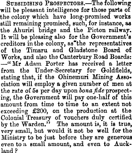 Subsidising Peospectoes. —The following will be pleasant intelligence for those parts of the colony which hare long-promised works still remaining promised, such, for instance, as the Ahuriri bridge and the Picton railway. It will be pleasing also for the Government's creditors in the colony, aa"the representatives of the Timaru and Gladstone Board of Works, and also the Canterbury Eoad Boards: —“ Mr Adam Porter has received a letter from the Under-Secretary for Goldfields, stating that, if the Ohinemuri Mining Association will employ a given number of men at the rate of 5s per day upon bona fide prospecting, the Government will pay one-half of this amount from time to time to an extent not exceeding £2OO, on the production at the Colonial Treasury of vouchers duly certified by the Warden.” The amount is, it is true, very small, but would it not be well for the Ministry to be just before they are generous even to a small amount, and even to Auckland ?