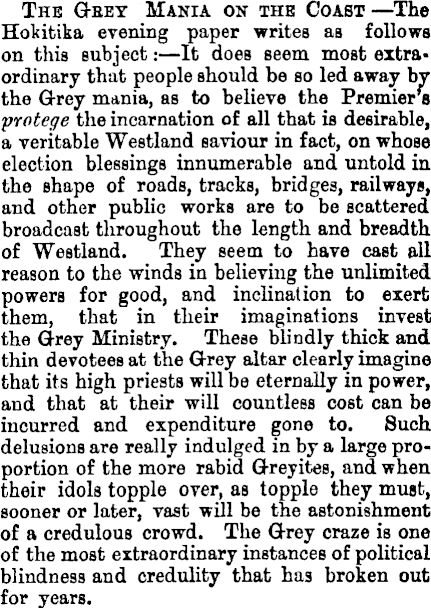 The Geey Mania on the Coast —The Hokitika evening paper writes as follows on tins subject:—lt does seem most extraordinary that people should be so led away by the Grey mania, as to believe the Premier’s protege the incarnation of all that is desirable, a veritable Westland saviour in fact, on whose election blessings innumerable and untold in the shape of roads, tracks, bridges, railways, and other public works are to be scattered broadcast throughout the length and breadth of Westland. They seem to have cast all reason to the winds in believing the unlimited powers for good, and inclination to exert them, that in their imaginations invest the Grey Ministry. These blindly thick and thin devotees at the Grey altar clearly imagine that its high priests will be eternally in power, and that at their will countless cost can be incurred and expenditure gone to. Such delusions are really indulged in by a large proportion of the more rabid Greyites, and when their idols topple over, as topple they must, sooner or later, vast will be the astonishment of a credulous crowd. The Grey craze is one of the most extraordinary instances of political blindness and credulity that has broken out for years.