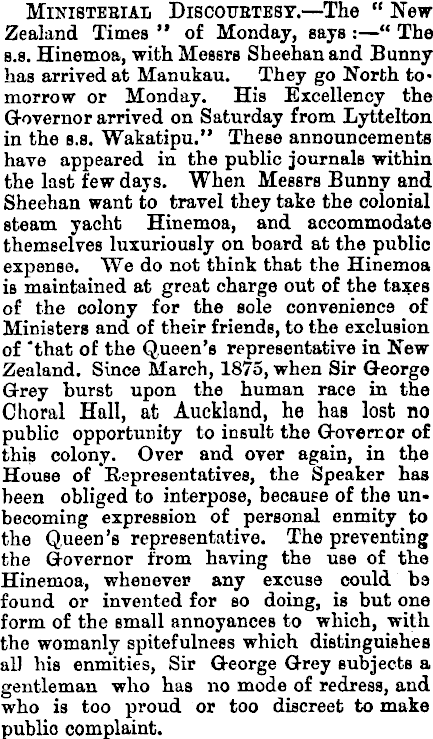 Ministerial Discourtesy.—The “ New Zealand Times ” of Monday, says : —“ The s.s. Hinemoa, with Messrs Sheehan and Bunny has arrived at Manukau. They go North tomorrow or Monday. His Excellency the Governor arrived on Saturday from Lyttelton in the s.s. Wakatipu.” These announcements have appeared in the public journals within the last few days. When Messrs Bunny and Sheehan want to travel they take the colonial steam yacht Hinemoa, and accommodate themselves luxuriously on board at the public expense. We do not think that the Hinemoa is maintained at great charge out of the taxes of the colony for the sole convenience of Ministers and of their friends, to the exclusion of 'that of the Queen’s representative in New Zealand. Since March, 1875, when Sir George Grey burst upon the human race in the Choral Hall, at Auckland, he has lost no public opportunity to insult the Governor of this colony. Over and over again, in the House of Representatives, the Speaker has been obliged to interpose, because of the unbecoming expression of personal enmity to the Queen’s representative. The preventing the Governor from having the use of the Hinemoa, whenever any excuse could be found or invented for so doing, is but one form of the small annoyances to which, with the womanly spitefulness which distinguishes all his enmities, Sir George Grey subjects a gentleman who has no mode of redress, and who is too proud or too discreet to make public complaint.