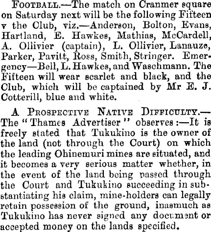 Football. —The match on Cranmer square on Saturday next will be the following Fifteen v the Club, viz.—Anderson, Bolton, Evans, Hartland, E. Hawkes, Mathias, McCardell, A. Ollivier (captain), L, Ollivier, Lanauze, Parker, Pavitt, Ross, Smith, Stringer. Emergency —Bell, L. Hawkes, and Waschmann. The Fifteen will wear scarlet and black, and the Club, which will bo captained by Mr E. J. Cotterill, blue and white. A Prospective Native Difficulty.— The “Thames Advertiser” observes: —It is freely stated that Tukukino is the owner of the land (not through the Court) on which the leading Ohinemuri mines are situated, and it becomes a very serious matter whether, in the event of the land being passed through the Court and Tukukino succeeding in substantiating his claim, mine-holders can legally retain possession of the ground, inasmuch as Tukukino has never signed any document or accepted money on the lands specified.