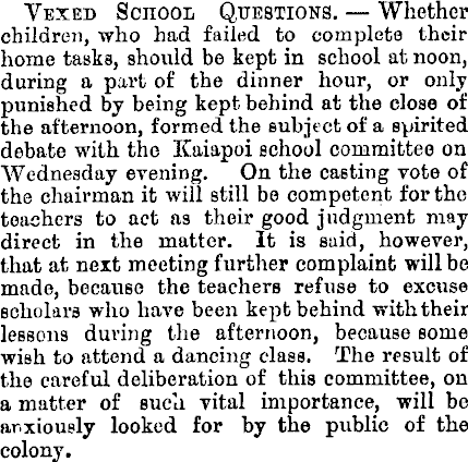 Vexed School Questions. Whether children, who had failed to complete their home tasks, should be kept in school at noon, during a part of the dinner hour, or only punished by being kept behind at the close of the afternoon, formed the subject of a spirited debate with the Kaiapoi school committee on Wednesday evening. On the casting vote of the chairman it will still be competent for the teachers to act as their good judgment may direct in the matter. It is said, however, that at next meeting further complaint will be made, because the teachers refuse to excuse scholars who have been kept behind with their lessons during the afternoon, because some wish to attend a dancing class. The result of the careful deliberation of this committee, on a matter of such vital importance, will be anxiously looked for by the public of the colony.
