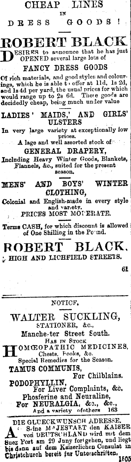 CHEAP LINES IN DEESS GOODS ! ESIR R S to announce that he has just OPENED several large lots of FANCY DRESS GOODS Of rich materials, and good stylesi and colourings, which he is able t ■ offer at lid, Is 2d, and Is 4d per yard, the usual prices for which would range up to 2a 6d. There goods are decidedly cheap, beiag much under value LADIES' MAIDS,' AND GIRLS' ULSTERS In very large variety at exceptionally low prices. A lage and well assorted stock of GENERAL DRAPERY, Including Heavy Winter Goods, Blankets, Flannels, &c., suited for the present season, WENS' AWD "BOYS' WINTER CLOTHING, Colonial and English-made in every stylo and variety. PRICES MOST MCTEEATE. Terms CASH, for which discount is allowed of One Shilling in the Pcrind, ROBERT"BLACK, HIGH AND LICHFIELD STREETS. NOTICF. WALTER "SUCKLING, STATIONER, &c, Manchester Street South. Has ix Stock IOMOEOPATHIC MEDICINES, Chests. Fooks, &c Special Remedies for the Season. TAMUS COMMUNIS, For Chilblains. ?ODOPHYLLIN, . . For Liver Complaints, &c. Phosferine and Nenialine, For NEURALGIA, &c, &c, And » variety ofother* 168 DIE GLCEGKWUNSOR ADRESSE. • S4ne M/JESTAIT den KAISER i, vori UEUTSfHLANU ivird rmt dem Suez Post am 29 Juny forigehen, und liegt pis d»nn auf dero Kaiflerlicheu Consulat in Cbristchurca bweit fur Unterßcbriften,