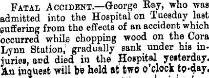 Fatal Accident.—George Kay, who was admitted into the Hospital on Tuesday last suffering from the effects of an accident which occurred while chopping wood on the Cora Lynn Station,' gradually sank under his injuries, and died in the Hospital yeiterday. An inquest will be held at two o'clock to-day-