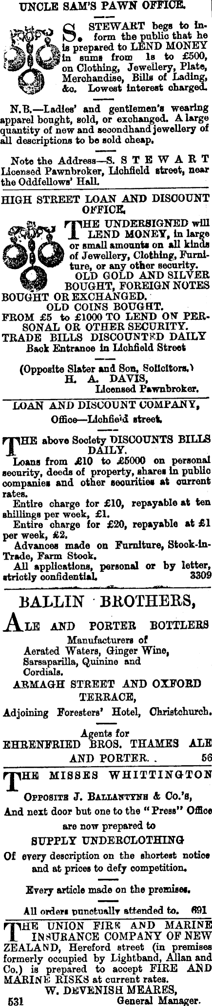 UNCLE SAM'S PAWN OFFICE. | f* STEWART begs to in- _ » form the publio that he ( ls prepared to LEND MONEY In sums from Is to £SOO, ' on Clothing, Jewellery, Plate, N.B.— Ladies' and gentlemen'B wearing apparel bought, sold, or exohanged. A large quantity of new and secondhand jewellery of all descriptions to be sold cheap. Note the Address—S. STEWART Licensed Pawnbroker, Lichfield street, near the Oddfellows' Hall. HIGH STREET LOAN AND DISCOUNT OFFICE, °" UNDERSIGNED will LEND MONEY, in large or small amounts on all kinds of Jewellery, Clothing, Furniture, or any other security. OLD GOLD AND SILVER BOUGHT, FOREIGN NOTES BOUGHT OR EXCHANGED. OLD COINS BOUGHT. FROM £5 to £IOOO TO LEND ON PERSONAL OR OTHER SECURITY. TRADE BILLS DISCOUNTED DAILY Back Entrance in Lichfield Street (Opposite Slater and Son, Solicitors. > H. A. DAVIS, Licensed Pawnbroker. LOAN AND DISCOUNT COMPANY, Office—Lichfield street HHE above Sooiety DISCOUNTS BILLS 1 DAILY. Loans from XlO to £SOOO on personal security, deeds of property, shares in publio companies and other securities at current rates. Entire charge tor £lO, repayable at ten shillings per week, £l. Entire charge for £2O, repayable at £1 per week, £2. Advances made on Furniture, Stook-in-Trade, Farm Stook. All applications, personal or by letter, strictly confidential. 3309 BALLIN BROTHERS, L LE AND PORTER BOTTLERS Manufacturers of Aerated Waters, Ginger Wine, Sarsaparilla, Quinine and Cordials. ARMAGH STREET AND OXFORD TERRACE, Adjoining Foresters' Hotel, Christchurch. Agents for EHRENFRIED BROS. THAMES ALE AND PORTER. HE MISSES WHITTINGTON Oppositb J. BAiiiAinrnirß & Co.'b, And next door but one to the " Press" Office are now prepared to SUPPLY UNDERCLOTHING Of every description on the shortest notice and at prices to defy competition. Every article made on the premises. All orders tranofcuallv attended to. 891 HE UNION FJRR AND MARINE INBUBANCE COMPANY OF NEW ZEALAND, Hereford street (in premises formerly occupied by Lightband, Allan and Co.) is prepared to accept FIRE AND MARINE RISKS at current rates. W. DEVENISH MEARES, 531 General Manager.