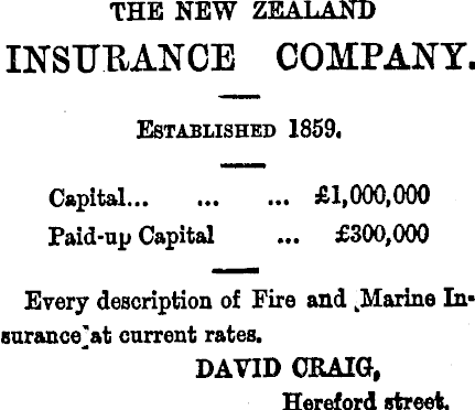 THE NEW ZEALAND INSURANCE COMPANY. Established 1859. Capital £1,000,000 Paid-up Capital ... £300,000 Every description of Fire and .Marine In* current rates. DAVID CRAIG, Hereford street.