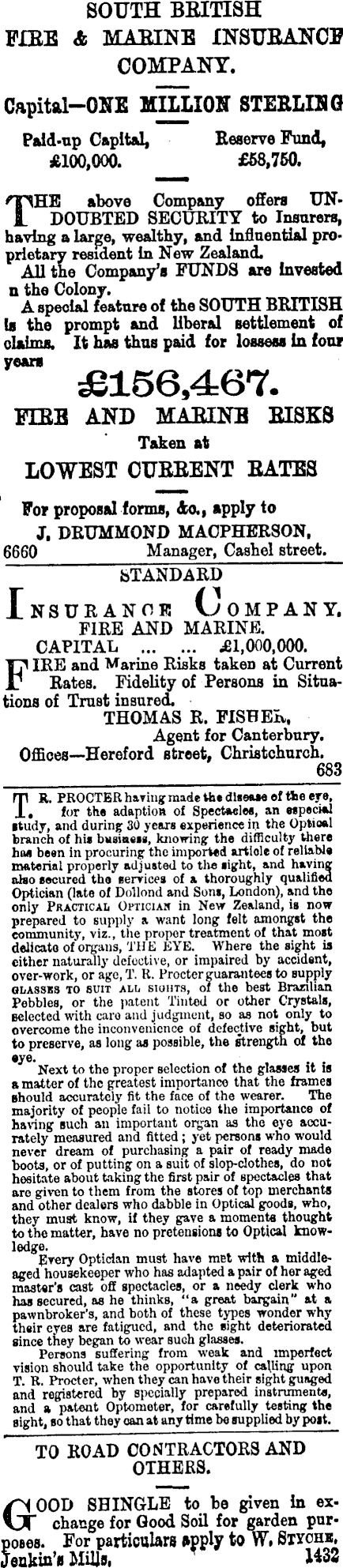 SOUTH BRITISH FXEB A MABINE INSUBANC]? COMPANY. Capital-ONE MILLION STERLING Paid-up Capital, £IOO,OOO. Reserve Fund, £58,750. THE above Company offers UNDOUBTED SECURITY to Insurers, having a large, wealthy, and influential proprietary resident in New Zealand. All the Company's FUNDS are invested n the Colony. A special feature of the SOUTH BRITISH is the prompt and liberal settlement of claims. It has thus paid for lossess in four F " £156,467. FTBB AND MABINB BISKS Taken at LOWEST OUBBENT BATES For proposal forms, &0., apply to J. DRUMMOND MACPHERSON, 6660 Manager, Cashel street. STANDARD 'NSURANOK VOMPANY, FIRE AND MARINE. CAPITAL .£1,000,000. I IRE and Marine Risks takeD at Current Rates. Fidelity of Persons in Situations of Trust insured. THOMAS R. FISHExv, Agent for Canterbury. Offices—Hereford street, Christchurch. R. PROCTER having made the disease of the eye, j.. for the adaption of Spectacles, an especial Study, and during 30 years experience in the Optioal branch of hie business, knowing the difficulty there had been in procuring the imported artiole of reliable material properly adjusted to the sight, and having alao secured the services of a thoroughly qualified Optician (late of Dollond and Sons, London), and the only Practical Optician in New Zealand, is now prepared to supply a want long felt amongst the community, viz., the propor treatment of that most delicate of organs, THE EYE. Where the sight is either naturally defective, or impaired by accident, over-work, or age, T. R. Procter guarantees to supply glasses to suit all siuHTs, of the best Brazilian Pebbles, or the patent Tinted or other Crystals, selected with care and judgment, so as not only to overcome the inconvenience of defective sight, but to preserve, as long as possible, the strength of the •ye. . . Next to the proper selection of the glasses it 18 a matter of the greatest importance, that the frames should accurately fit the face of the wearer. The majority of people fail to notice the importance of having such an important organ as the eye accurately measured and fitted ; yet persons who would never dream of purchasing a pair of ready made boots, or of putting on a suit of slop-clothes, do not hesitate about taking the first pair of spectacles that are given to them from the stores of top merchants and other dealers who dabble in Optical goods, who, they must know, if they gave a momenta thought to the matter, have no pretensions to Optical knowledge. Every Optician must have met with a middleaged housekeeper who has adapted a pair of her aged master's cast off spectacles, or a needy clerk who has secured, as he thinks, "a great bargain" at a pawnbroker's, and both of these types wonder why their eyes are fatigued, and the sight deteriorated since they began to wear suGh glasses. Persons suffering from weak and imperfect vision should take the opportunity of casing upon T. R. Procter, when they can have their sight guaged and registered by specially prepared instruments, and a patent Optometer, 'or carefully testing the sight, so that they can at any time be supplied by post. TO ROAD CONTRACTORS AND OTHERS. ~'OOD SHINGLE to be given in exchange for Good Soil for garden pur-